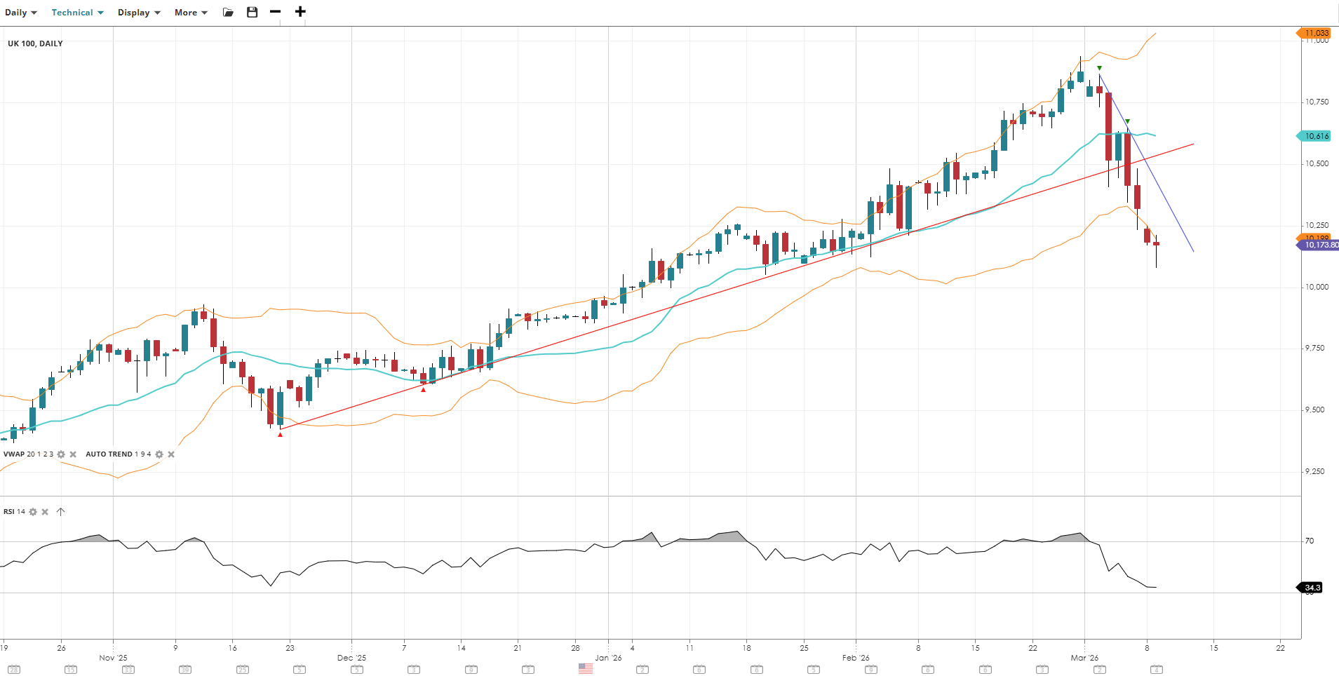 UK 100 has reversed sharply from recent highs and entered a deep correction, likely a new bearish trend, now trading below the VWAP after breaking a key ascending trendline. Momentum has deteriorated significantly, with RSI retreating toward oversold levels as the index gives back a substantial portion of its prior advance.