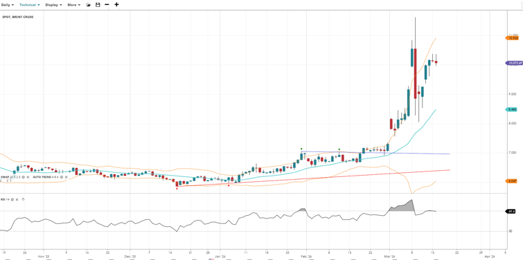Brent Crude remains in a powerful bullish impulsive phase, trading well above its VWAP following a significant breakout. RSI has eased from extreme overbought levels toward 70 as the market digests recent gains, though the trend remains firmly upward with price holding near the top of its volatility range.