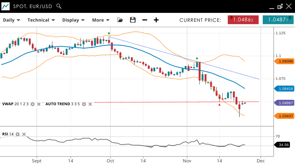 EUR/USD remains distinctly bearish - having not crossed adobe the VWAP in 2 weeks. The price at 1.0486 is still below the VWAP (20) of 1.0641. Support is at 1.0343, with resistance at 1.0939. The RSI at 34 signals continued bearish momentum but the rebound from more oversold conditions indicates a possible retracement soon.